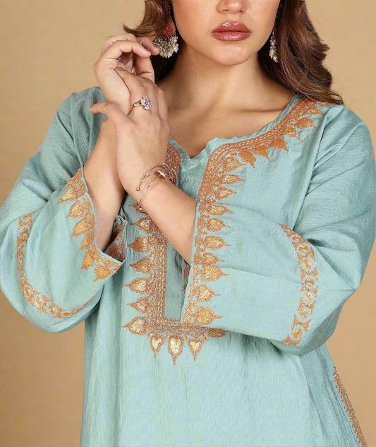 Celadon Green Kashmiri Tilla Embroidered Summer Pheran Set