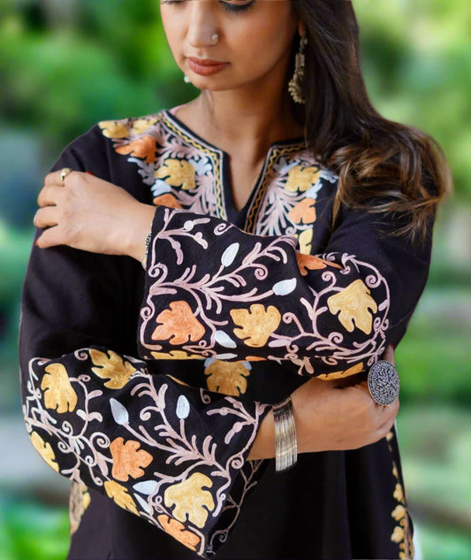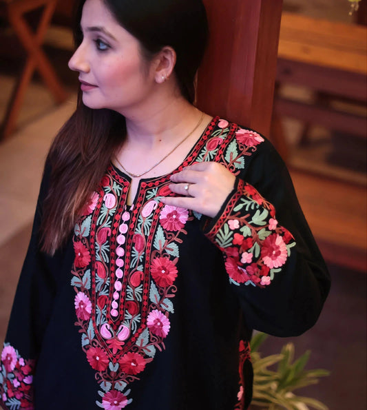 Aari Embroidered | Black Colored and Floral Design | Ladies Woolen Phiran