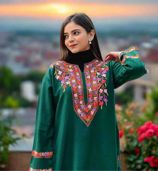 Fine Woolen Ladies Phiran | Forest Green | Embroidered | With Pockets