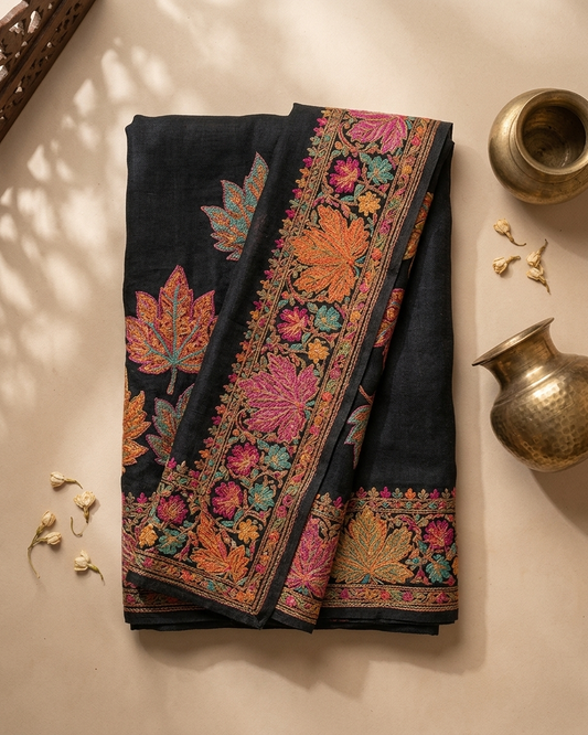 Craftique Kashmir Designer Saree and Blouse Set | Premium Cotton Self Woven | Chinar Embroidery Royal Black Coloured