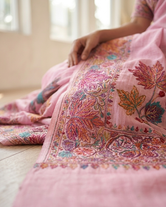 Craftique Kashmir Designer Saree and Blouse Set | Premium Cotton Self Woven | Chinar Embroidery Stylish Pink Coloured