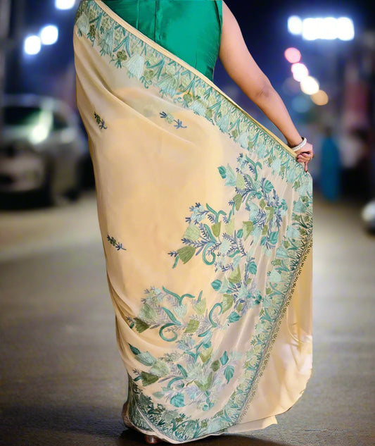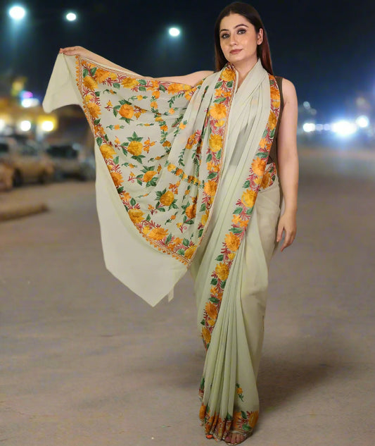 Light Olive Green | Aari Embroidered | Georgette Saree