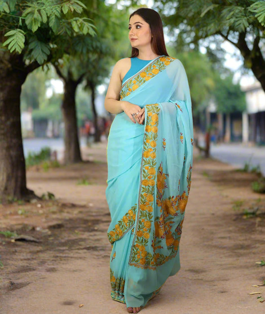 Aari Embroidered | Light Baby Blue | Georgette Saree