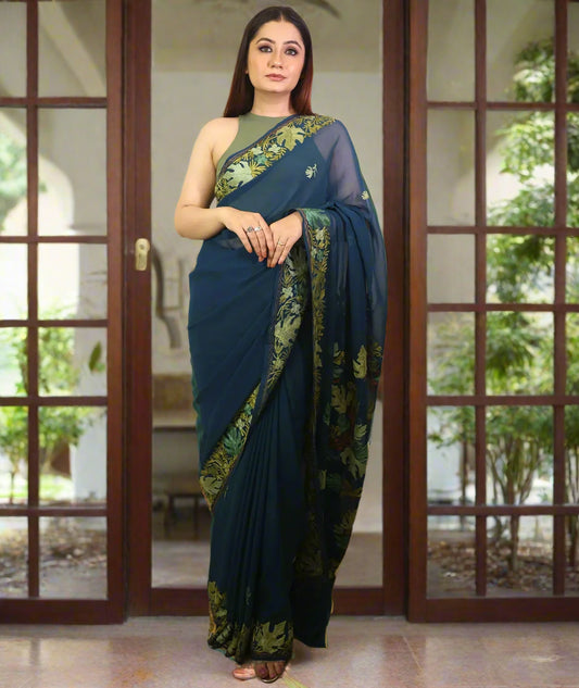 Chinar Aari Embroidered | Georgette Saree | Black Forest Green