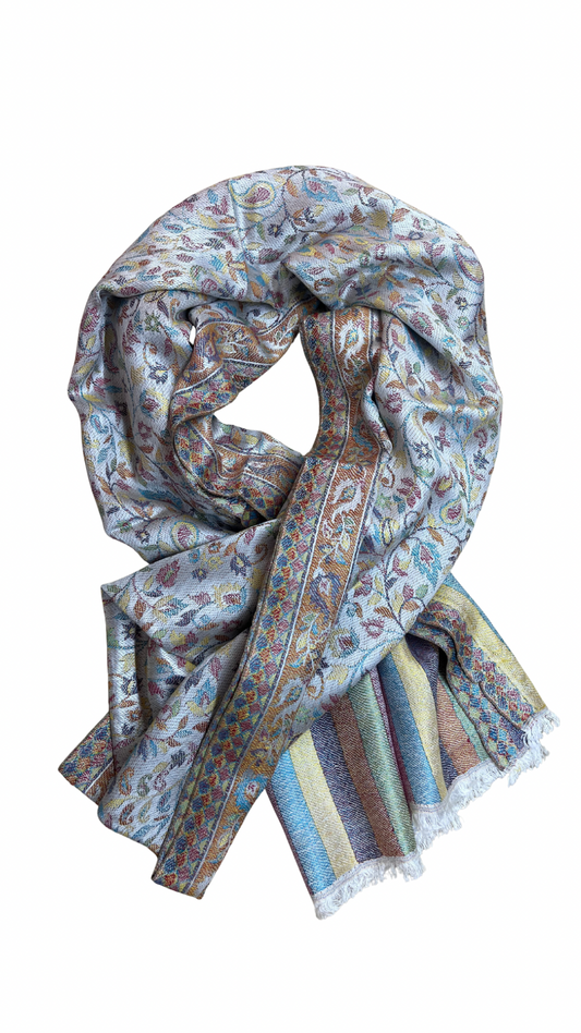 Semi Pashmina Kani Stole | Light Grey Paisley Colored | Kashmiri Woven Stole