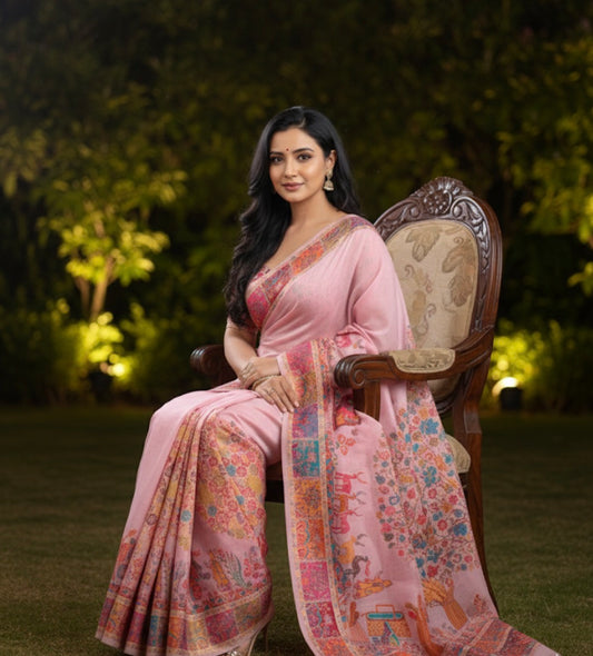 Craftique Kashmir Designer Saree and Blouse Set | Premium Cotton Self Woven | Kalamkaari Pink Coloured