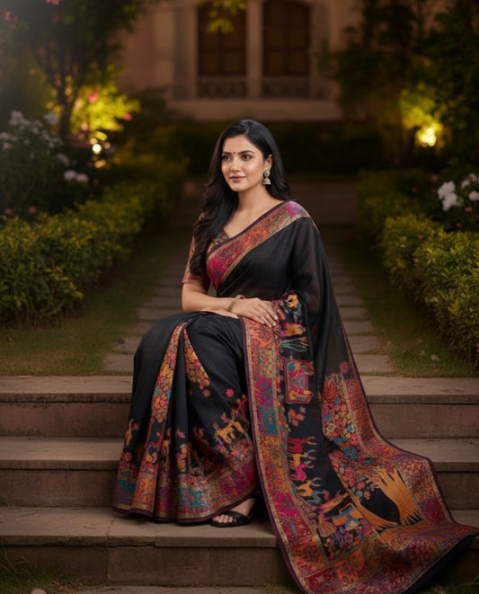 Craftique Kashmir Designer Saree and Blouse Set | Premium Cotton Self Woven | Kalamkaari Black Coloured
