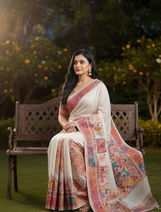 Craftique Kashmir Designer Saree and Blouse Set | Premium Cotton Self Woven | Kalamkaari Premium White Coloured