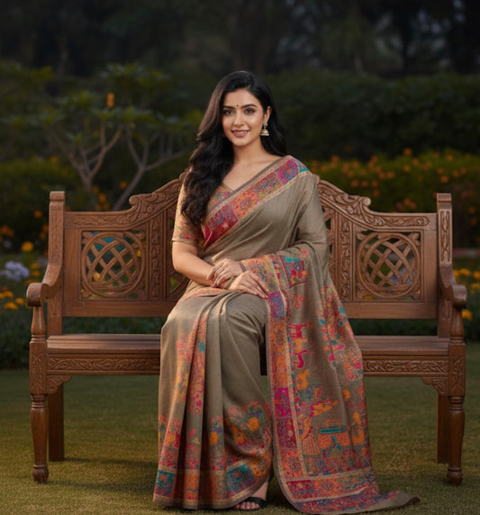 Craftique Kashmir Designer Saree and Blouse Set | Premium Cotton Self Woven | Kalamkaari Grey Coloured