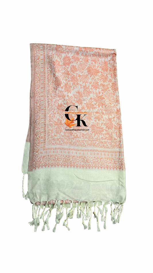 Soft Wool Stole | White Base Light Orange Colored | Chinar Leaf Pattern