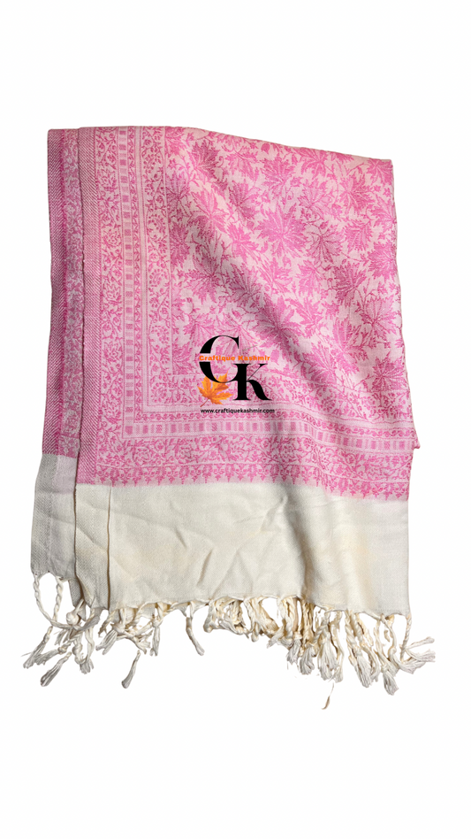 Soft Wool Stole | White Base Light Pink Colored | Chinar Leaf Pattern