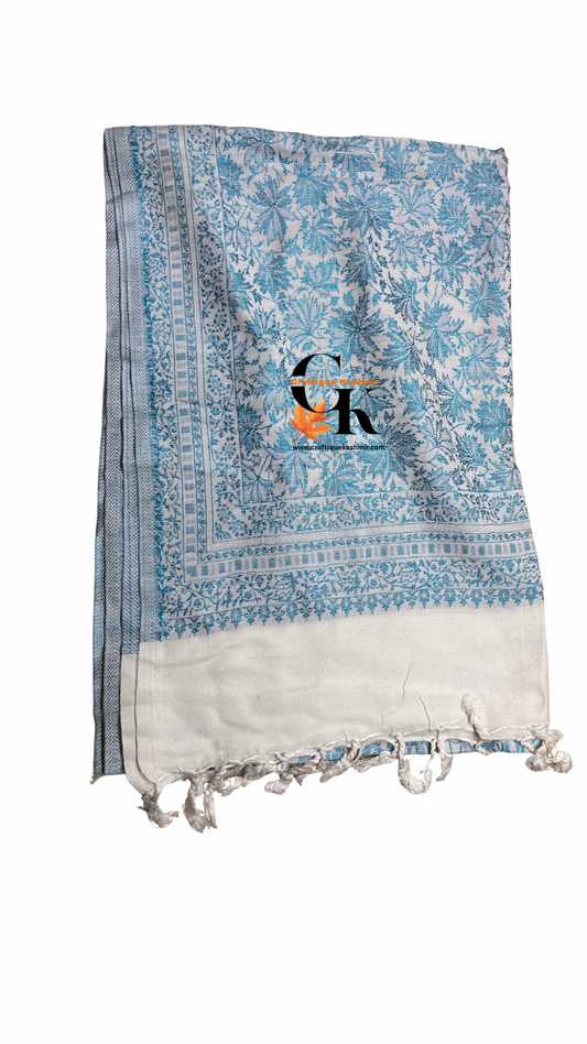 Soft Wool Stole | White Base Blue Colored | Chinar Leaf Pattern